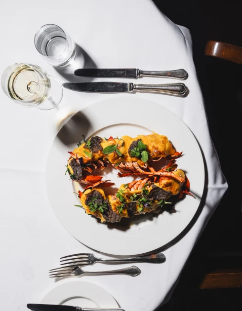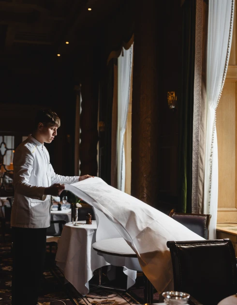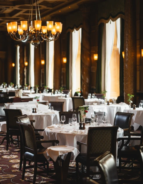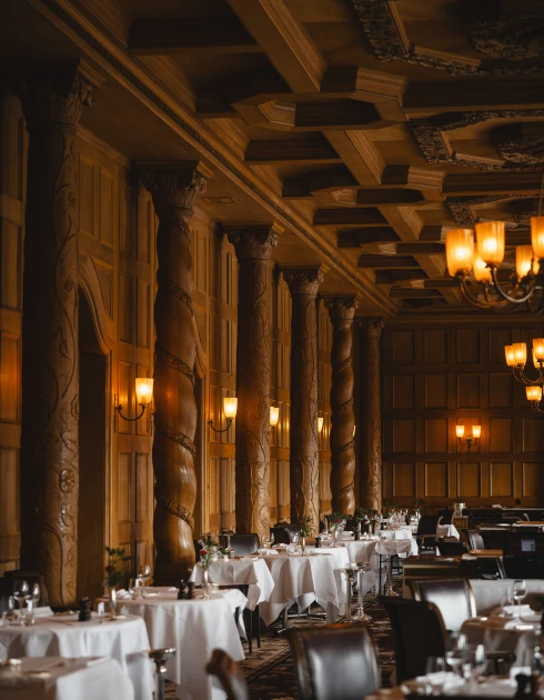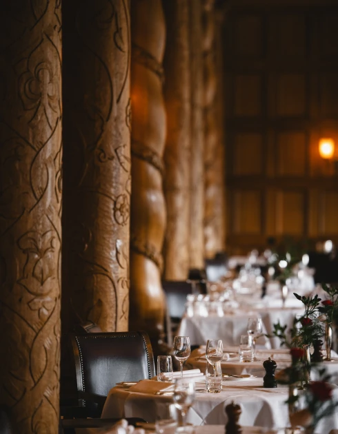 Gedämpftes Licht, hochwertige Täfelung, kunstvoll geschnitzte Säulen aus massiver Eiche und über allem eine aufwendig verzierte Kassettendecke: Der grosse Speisesaal atmet Geschichte. Hier zelebriert unser Küchenchef Fabrizio Zanetti seine Philosophie einer marktfrischen französischen Küche mit internationaler Note (17 Punkte GaultMillau).